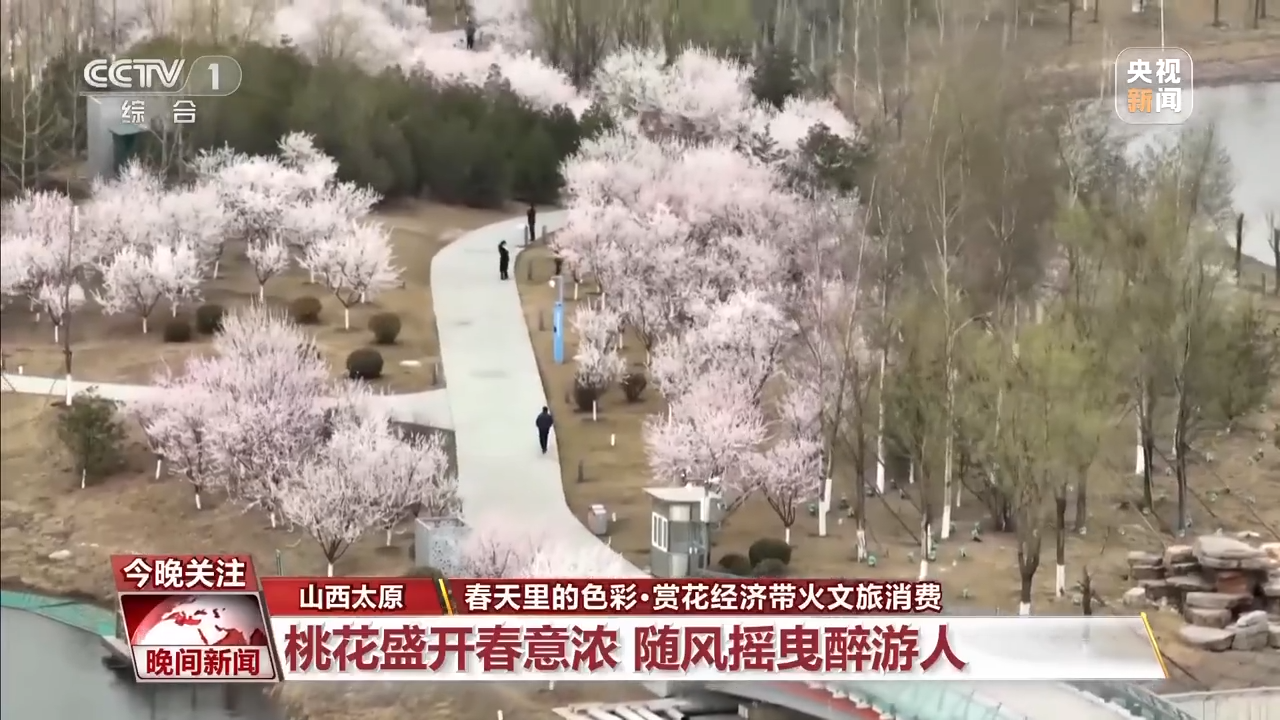 竹外桃花三两枝,春江水暖鸭先知。跟随航拍镜头,我们首先来到山西太原的晋阳湖畔。 从空中俯瞰,大片桃花沿湖盛放,一排排、一簇簇粉白相间的桃花与湖水交相辉映,构成一幅唯美的春日画卷。桃林之中,沿着蜿蜒的步道,市民和游客三两结伴徜徉在层层叠叠的花海之中,为彼此拍照留念,感受着春风十里桃花开的诗情画意,定格专属于春日的浪漫时刻。