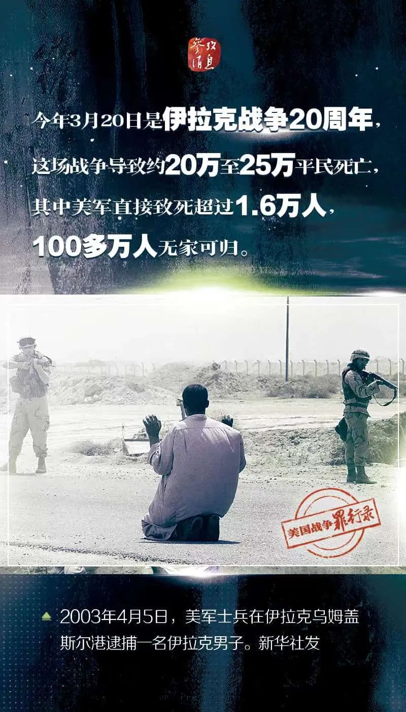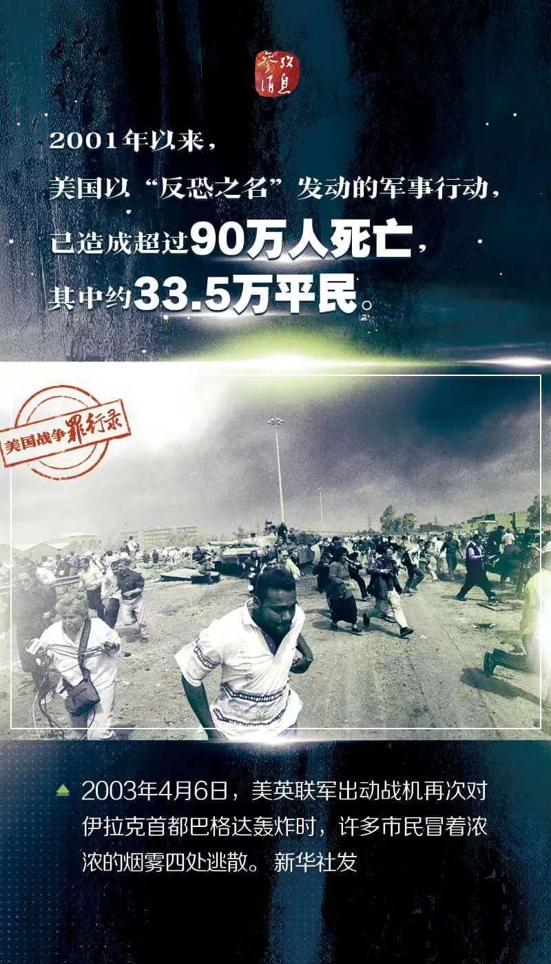 【罪行】2001年“9·11”恐袭发生后,美国及其盟友以阿富汗塔利班拒绝交出“基地”组织头目本·拉丹为由,于当年10月初对阿发动军事打击,迅速推翻塔利班政权并以反恐为由长期驻军。2021年8月30日,最后一架美军运输机从喀布尔国际机场起飞,这场美国“史上最漫长战争”以美军黯然撤离告终。这场持续近20年的战争造成47245名阿富汗平民以及6.6万至6.9万名与“9·11”事件无关的阿富汗军人和警察在美军行动中丧生,1000多万人流离失所。