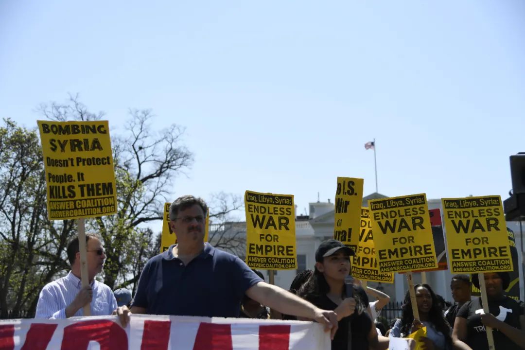 ▲2018年4月14日,在美国华盛顿白宫北侧,人们手持标语抗议对叙利亚进行军事打击。(新华社)