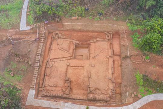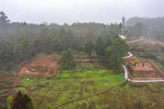 这是2月9日在重庆合川钓鱼城遗址拍摄的新发掘出的类似阙台建筑的基址(无人机照片)。新华社记者 黄伟 摄