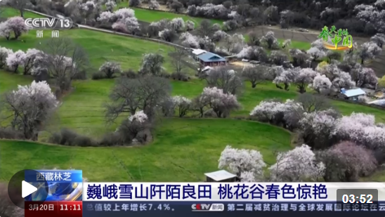 总台记者 普布次仁:花开时节,花海连绵五十余公里。在雪山脚下,这里的桃花会随着海拔气候的起伏变化,从每年的3月中下旬开始依次绽放,层层渐染,持续月余。田野新绿、雪山巍峨,间或独具特色的村落、民居,让人仿佛置身世外桃源山水画卷。桃花谷独特迷人的风景惊艳了春天,也让这里成了赏花旅游的重点区域。