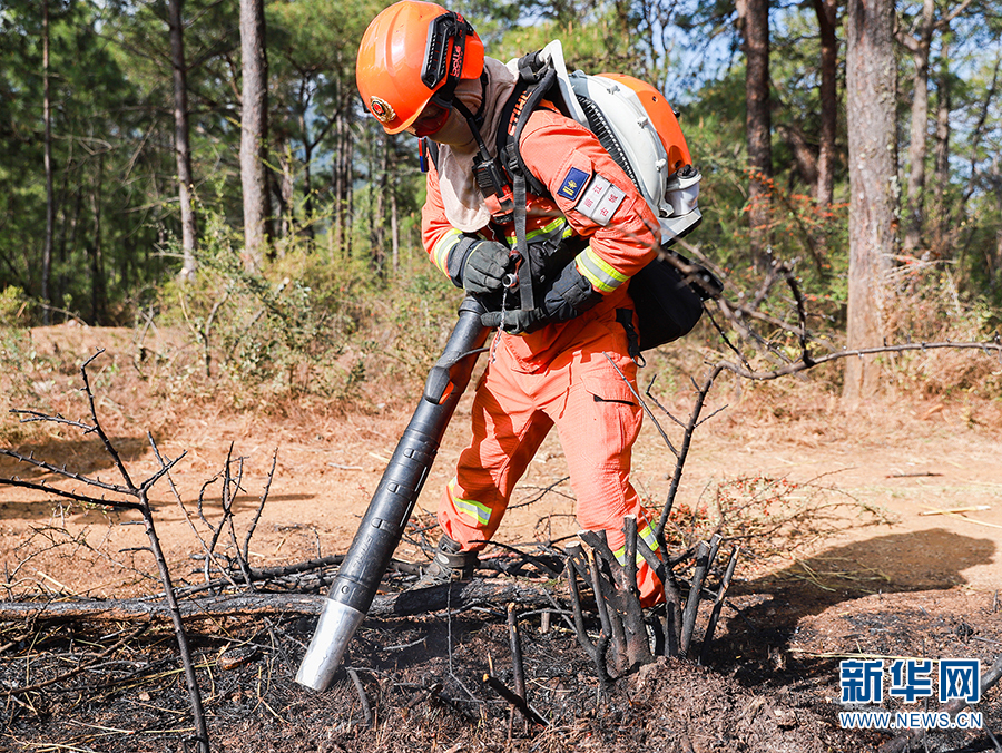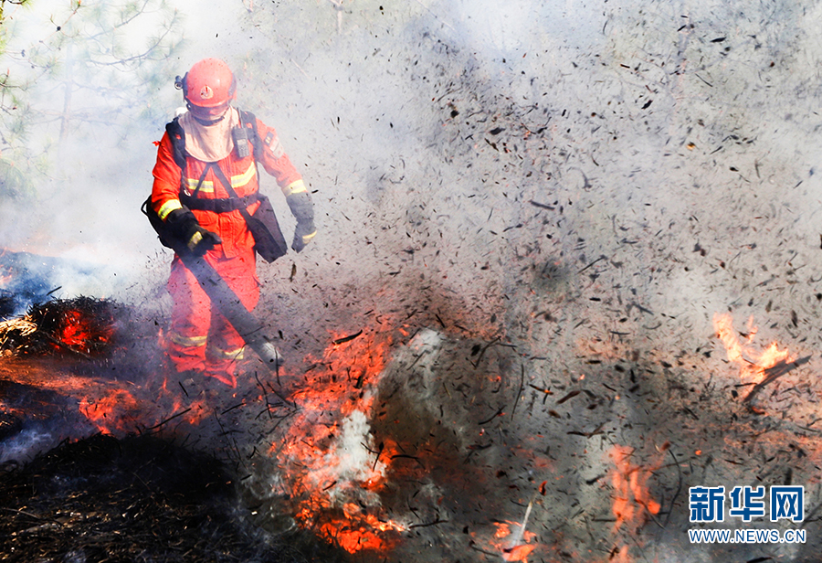 森林消防员利用风力灭火机对火线进行扑打(摄于3月17日)。
