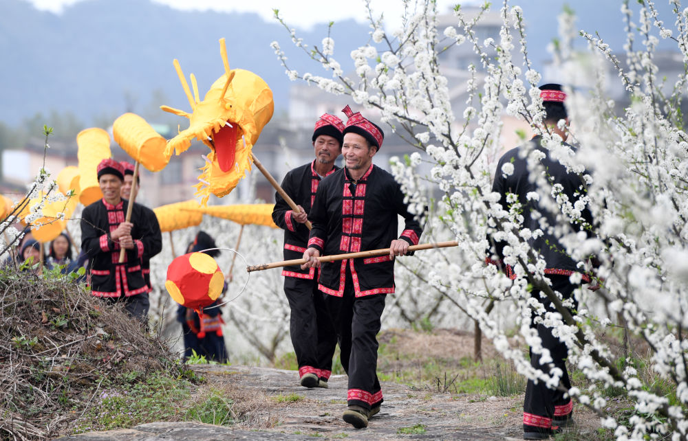 3月17日,广西金秀瑶族自治县忠良乡巴勒村李花绽放,村民正在舞龙,不少游客前来踏春赏花。新华社记者 陆波岸 摄