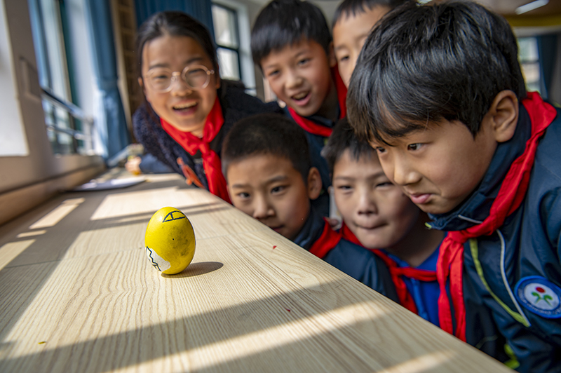 3月20日,在湖南省资兴市第一完全小学,孩子们在玩“立蛋”游戏。新华社发(李科 摄)