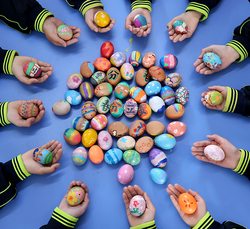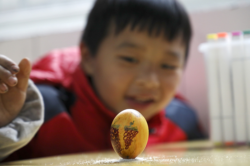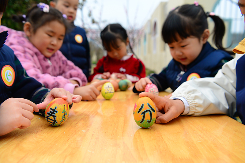3月20日,江苏省无锡市阳山中心幼儿园的小朋友在玩“立蛋”游戏。新华社发(还月亮 摄)