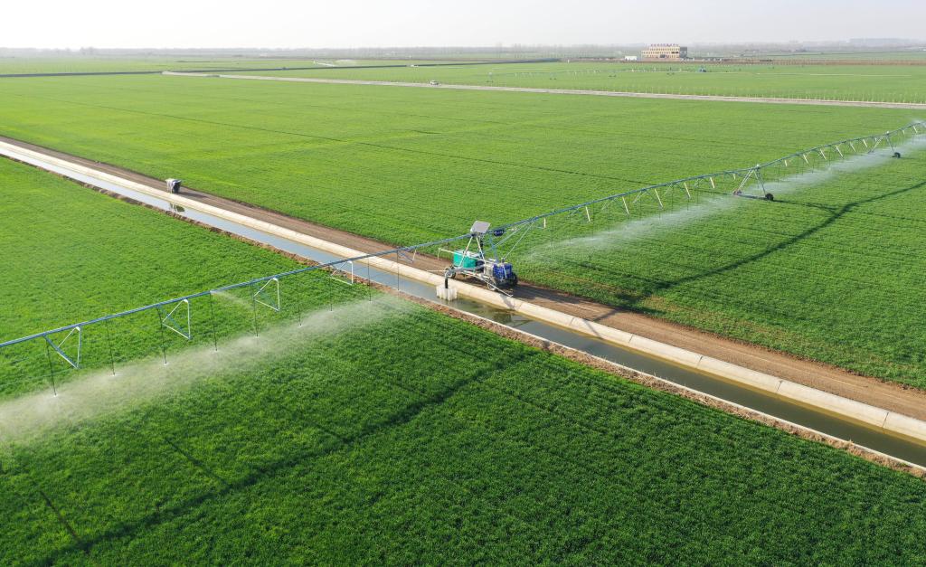 中原腹地,河南省西平县老王坡3.1万亩高标准农田,一架架平移喷灌机正在对即将迎来拔节期的冬小麦进行春灌。“智能灌溉系统太方便了,我种植的1700亩小麦只需要两三天就能全部浇透,相信今年又是一个丰收年!”种粮大户吴乐说。