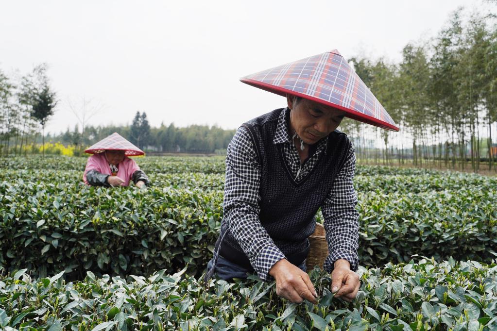 四川省蒲江县甘溪镇明月村村民杨安明(前)在茶园采摘明前茶。新华社记者邢拓摄