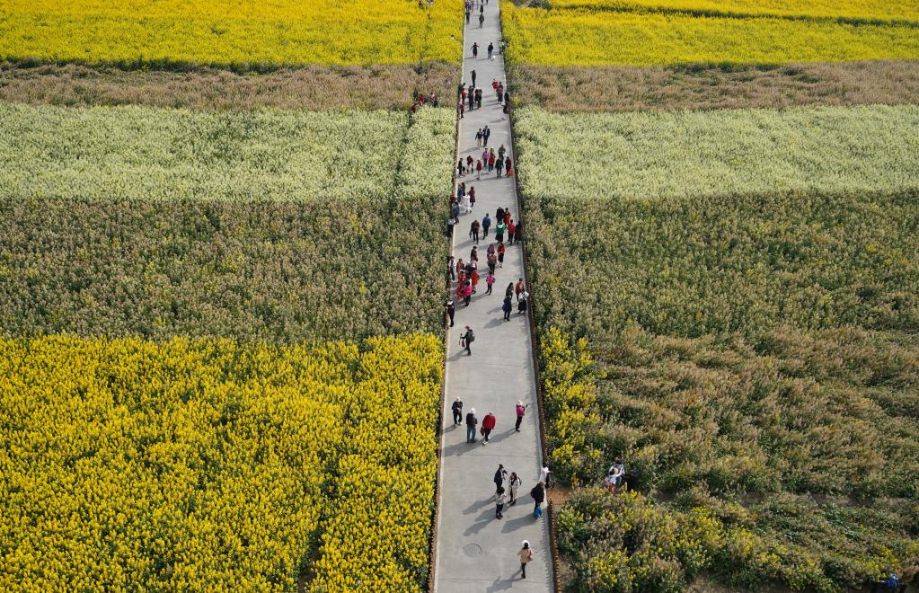 四川省成都市天府农博园长达2公里左右的彩色油菜花带贯穿南北。人们登上“二十四节气”观景塔,俯瞰这片花海。“我们选取了兼具观光和油用价值的8个颜色品种,包括深粉、纯白、桃红、红色、橘红、极橘黄、极紫红和普通黄色,更好助力农文旅融合发展。”天府农博园农业专家柯建国教授介绍。