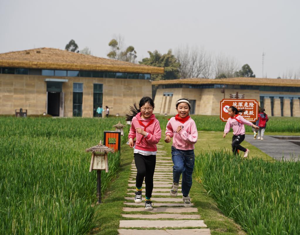 3月14日,学生们在位于成都市新津区的宝墩遗址展馆麦田里游玩。新华社记者邢拓摄