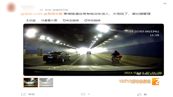 前两天,有市民在社交平台上反映,草海隧道经常有电动车和摩托车驶入,十分危险,希望交警部门和隧道管理方加强管理。