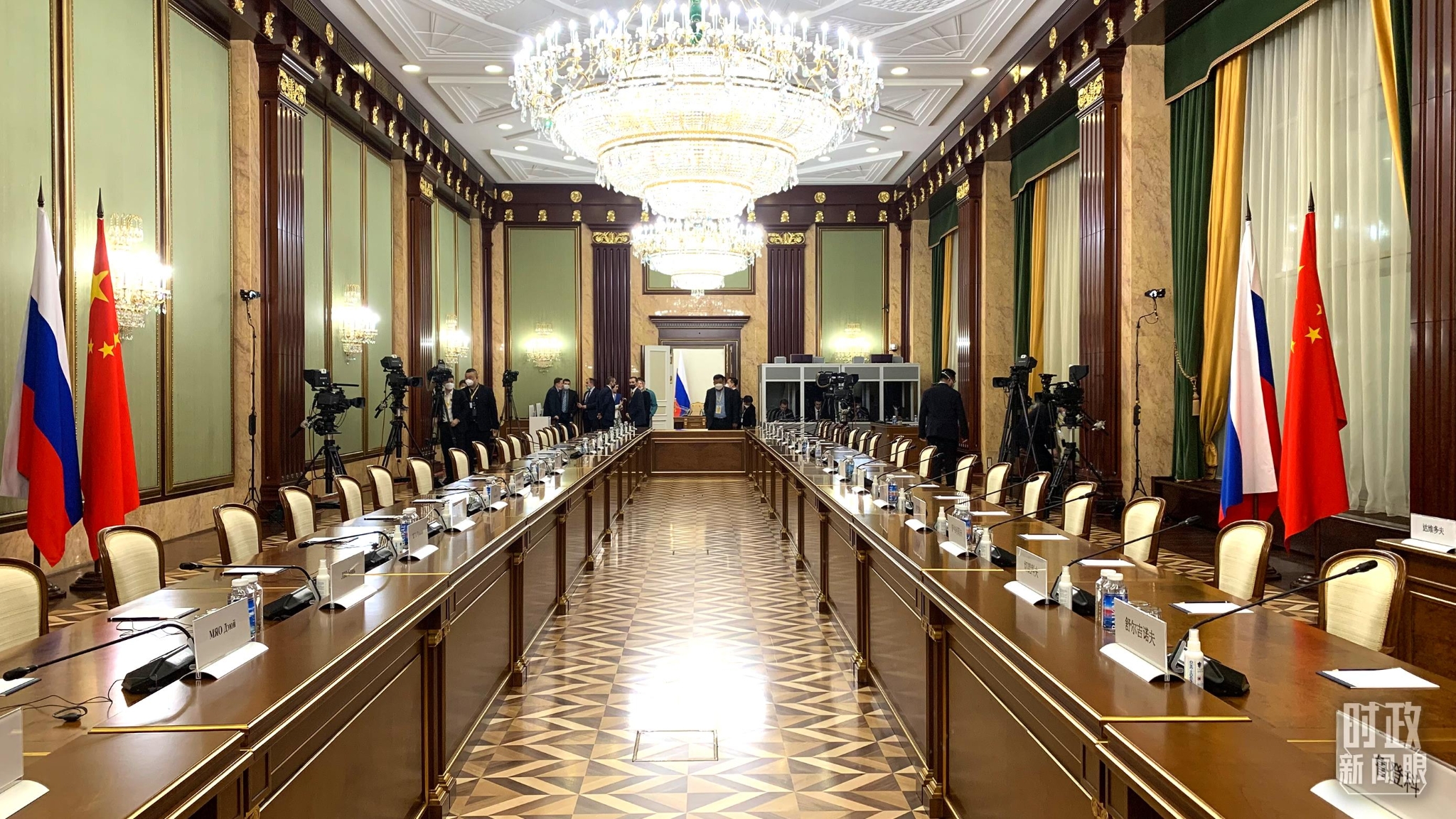 △习主席和普京总统举行大范围会谈的会场。(总台央广记者潘毅拍摄)