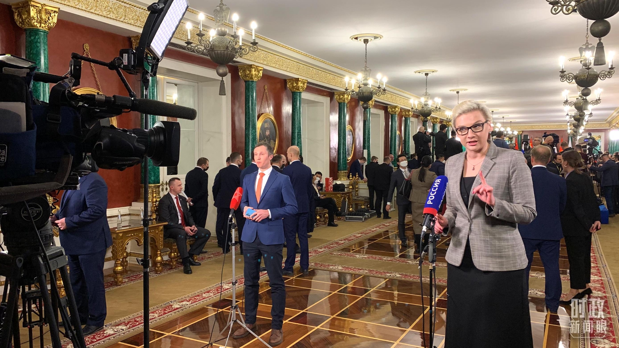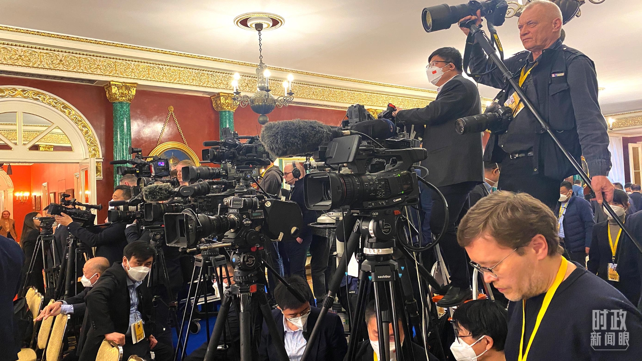 △等待中俄两国元首共见记者的中外媒体同仁。(总台央视记者段德文、李辉拍摄)