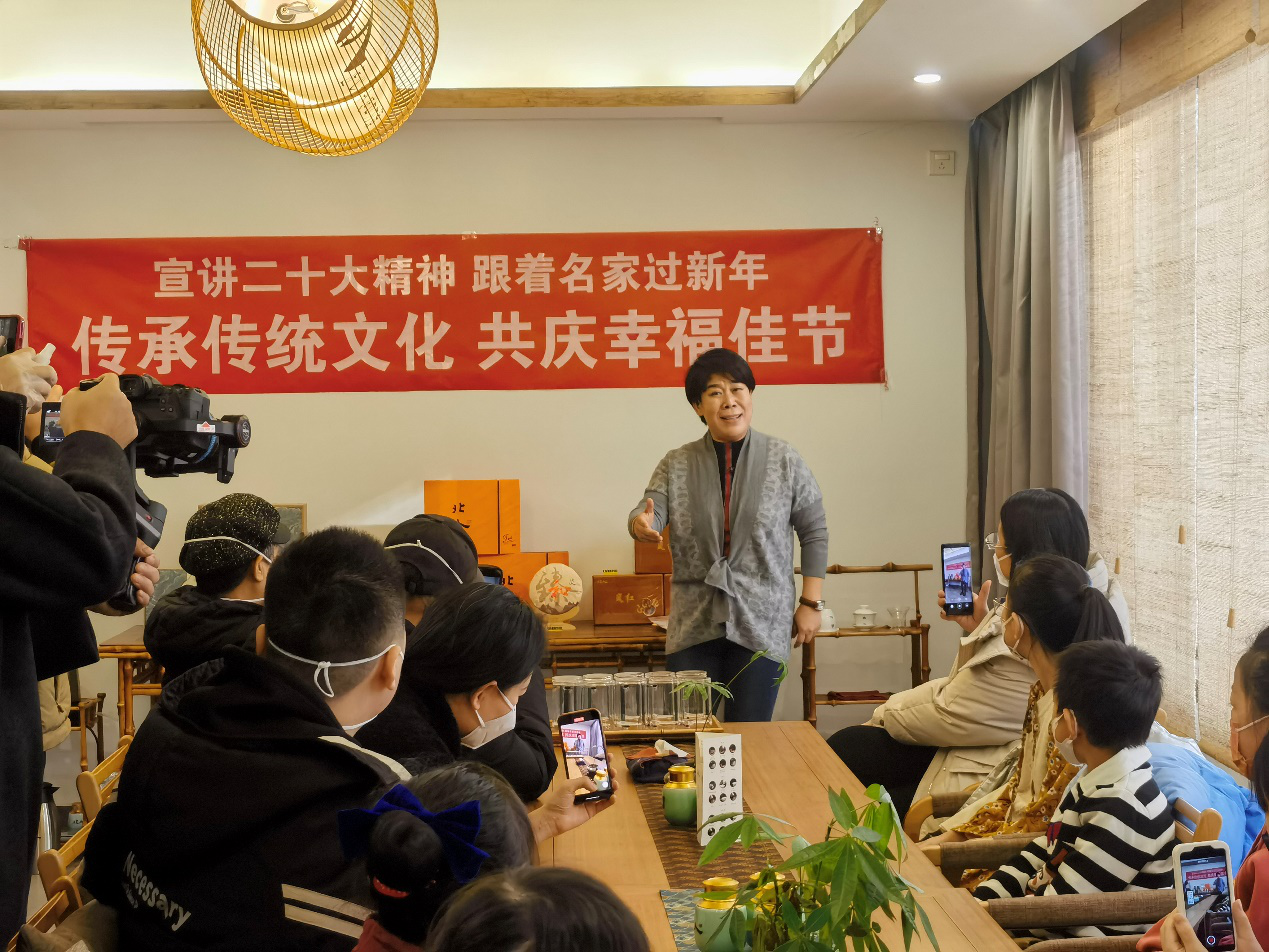 2023年1月1日,任源艺术空间举办“宣讲二十大精神,跟着名家过新年”活动。图为河北梆子著名表演艺术家、中国戏剧梅花奖得主吴桂云用河北梆子声腔艺术唱着宣讲党的二十大精神。石家庄市委宣传部供图