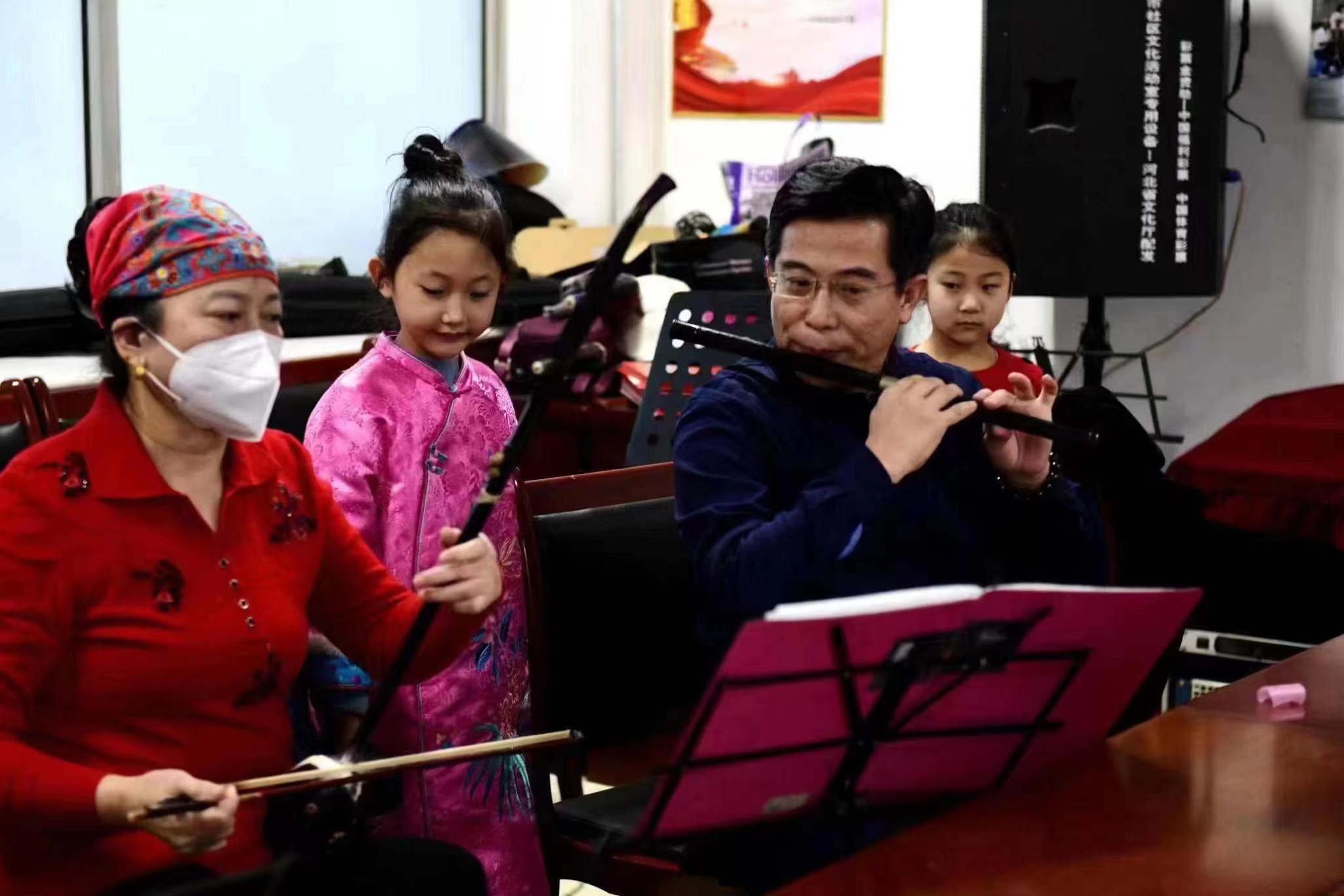 在石家庄市张勇工作室,音乐家张勇(右二)在指导文艺爱好者练习民乐演奏。石家庄市委宣传部供图