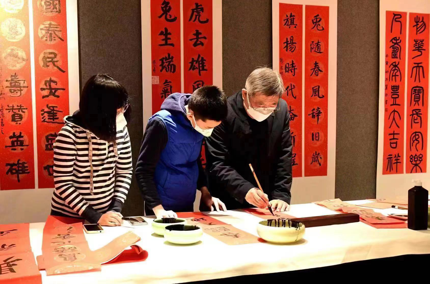 在石家庄市刘金凯工作室,书法家刘金凯(右)指导小学员写春联。石家庄市委宣传部供图