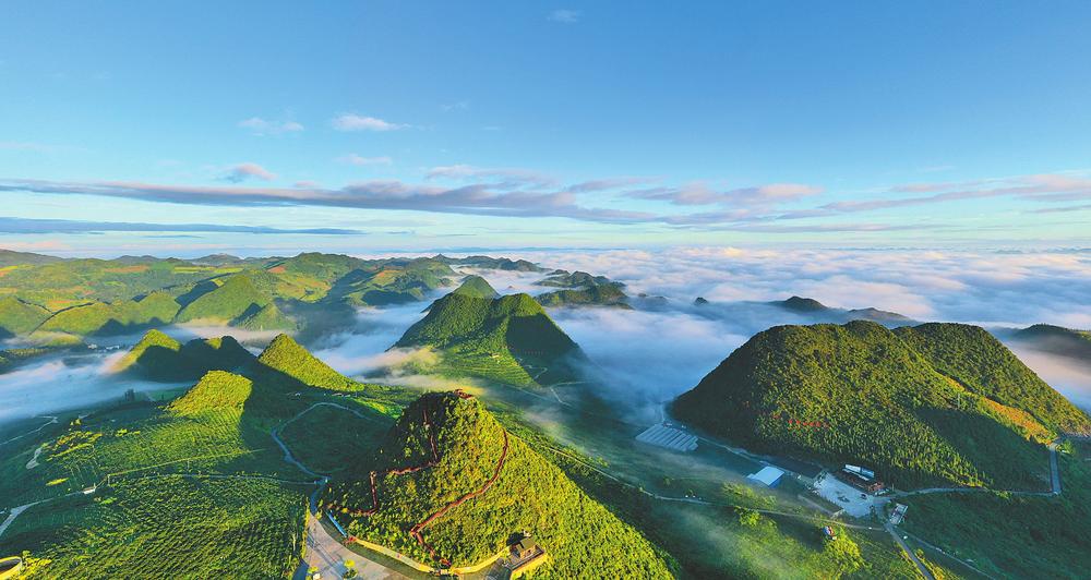 文山州面积3.14万平方公里,岩溶地貌占53.4%,石漠化面积占岩溶面积的71.1%,是云南石漠化最为严重、生态环境最为脆弱的地区。数十年来,特别是党的十八大以来,苦干实干的文山人探索出了“六子登科”的石漠化治理经验,全州石漠化综合治理面积累计达到255万亩,森林覆盖率超51%,实现了从石漠遍布到喀斯特绿洲的美丽蝶变。图为西畴县三光片区山变青、产业兴。熊平祥/图