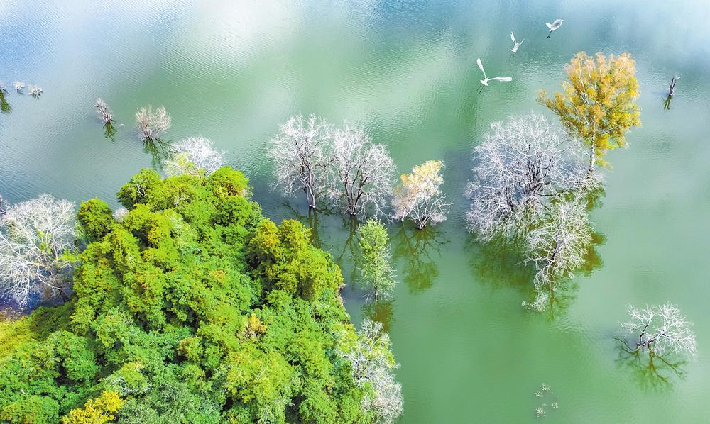 文山州稳步实施天然林保护、退耕还林还草、防护林体系建设、湿地保护与恢复、石漠化综合治理等一批重大林草生态保护与修复工程,加快推进国土绿化,全州森林面积157.96万公顷,森林蓄积量达6497万立方米,草原植被盖度达87.3%,森林覆盖率由“十一五”末的37.6%提高到50.29%。图为候鸟“天堂”德厚水库。熊平祥/图