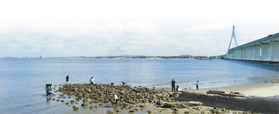 远处,阵阵海浪拍打着防潮堤,忙着赶海的渔民、游客抬头看去,海文大桥凌空飞渡,桥上车水马龙、川流不息。(人民日报 记者孙海天)