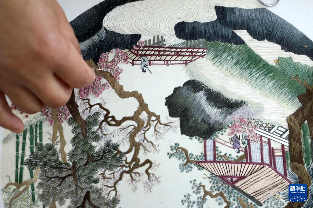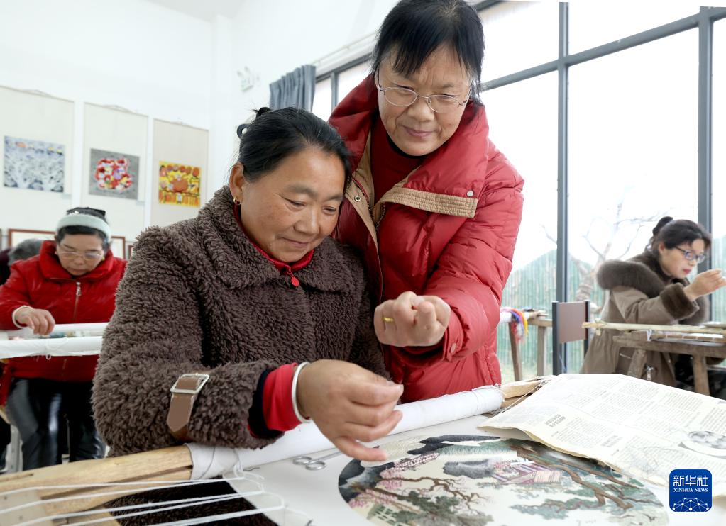 近年来,江苏省淮安市淮安区博里镇传承发展民间艺术,深入挖掘“博里农民画”文化精髓,不仅举办农民画培训班,还将“博里农民画”制作成为刺绣作品。目前,博里镇有农民画画家200多人、绣娘超过50人,作品远销海内外。“博里农民画”等“指间技艺”不仅实现了“文旅融合”带动当地发展,还吸引周边一批外出务工人员返乡就业。(新华社记者 陈建力 摄)