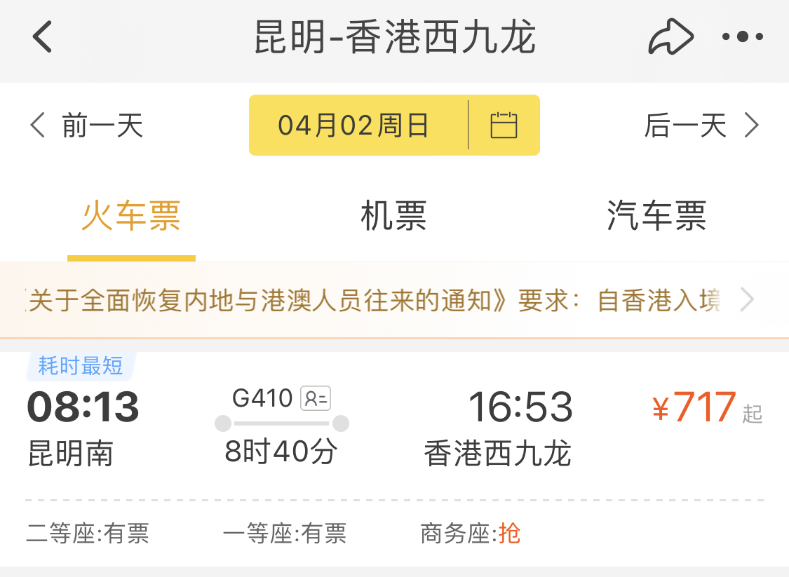 记者查询到,昆明南至香港西九龙动车自4月2日起开行,车次为G410/07次,昆明南8:13始发,经停贵阳北、桂林西、广州南、深圳北,于16点53分终到香港西九龙。香港西九龙至昆明南动车自4月1日起开行,车次为G408/9次,香港西九龙12:05始发,经停深圳北、虎门、广州南、桂林西、贵阳北,于20:50终到昆明南。该趟列车的往返单程成人票价为二等座717元、一等座1167元、商务座2188元。