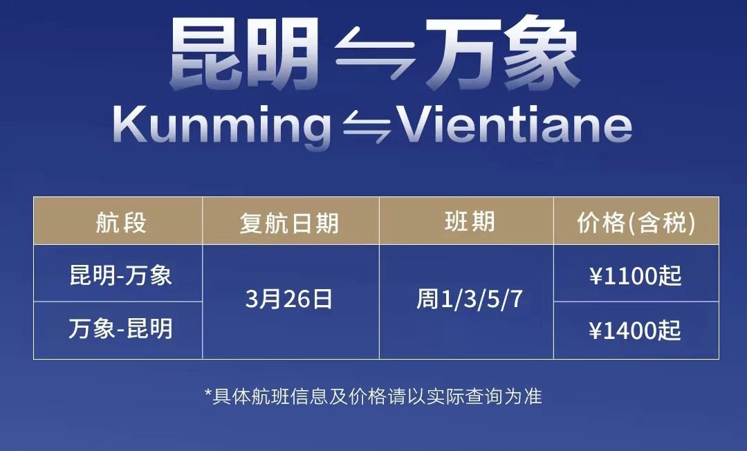 据了解,换季后,川航云南航线将达64条,以昆明及版纳进出港为主。换季当天,川航将恢复昆明=万象国际航线,采用A320机型执飞,每周四班(周1/3/5/7)。