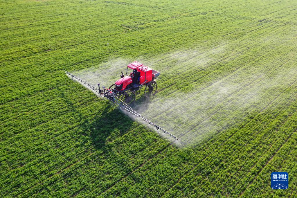 安徽省蒙城县双涧镇农民为小麦喷洒防治病虫害药物(2023年2月27日摄,无人机照片)。新华社发(胡卫国摄)