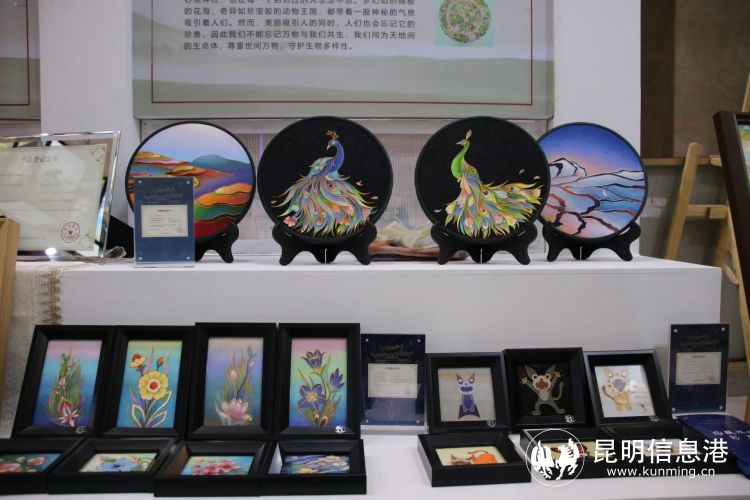 德源文化公司的掐丝珐琅文创作品,将传统非遗技艺与云南地标、云南特色相结合,以展现金马碧鸡坊来源的作品《金碧生烟》,表现云南“动植物王国”和生物多样性的作品《向往云南》,以及光影之下的元阳梯田、开屏的孔雀等,一幅幅讲述云南故事的作品,不仅能作为旅游商品,通过使用创新活性炭材料,更是兼具了吸附异味的功能性。