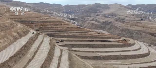 在固原市西吉县将台堡镇崔中村的梯田里,7台大型机械正加紧作业,将几道较窄梯田合并推成更宽、更长的梯田。