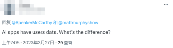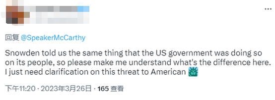 另一方面,一些网友提到,美国的社交媒体也在将用户资料交给美国政府。有人质问麦卡锡,“我们的联邦政府拥有完全相同的权限,并且已经在欺骗我们大众。你打算怎么做?”