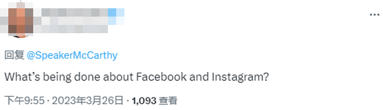 麦卡锡为美国国会打压TikTok的做法站台,引来网友又一轮抨击。有网友评论称,“……真正值得担忧的是,TikTok的CEO看起来比国会中的任何人都更诚实……Facebook,MSM对美国人民的威胁比TikTok更大”。