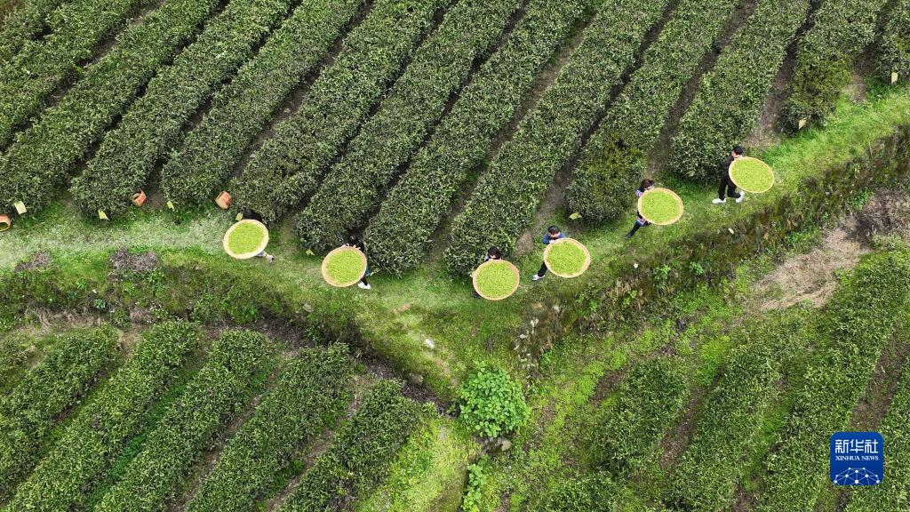 3月20日,在湖南衡阳常宁市塔山瑶族乡,技术人员在茶园指导茶农采茶(无人机照片)。新华社记者 赵众志 摄