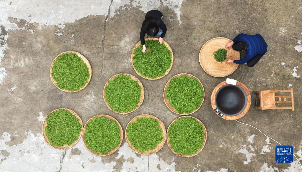 3月20日,在湖南衡阳常宁市塔山瑶族乡,茶农在炒茶(无人机照片)。新华社记者 赵众志 摄