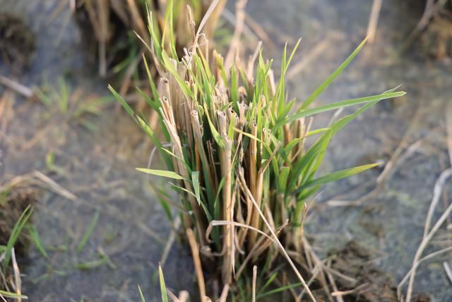 2月中旬,多年生稻稻桩已长出小秧苗。