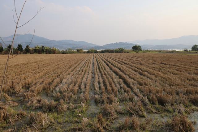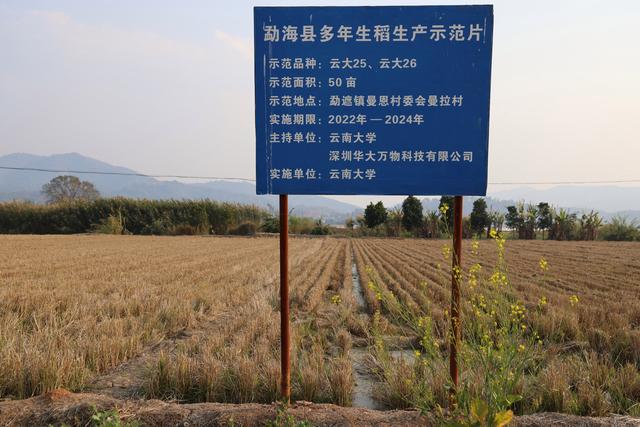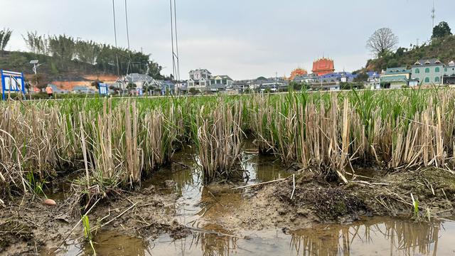 “云南大学多年生稻科技小院”多年生稻生产示范片。这是去年收割后留下的稻桩,等待春天地下茎萌发长成新苗。