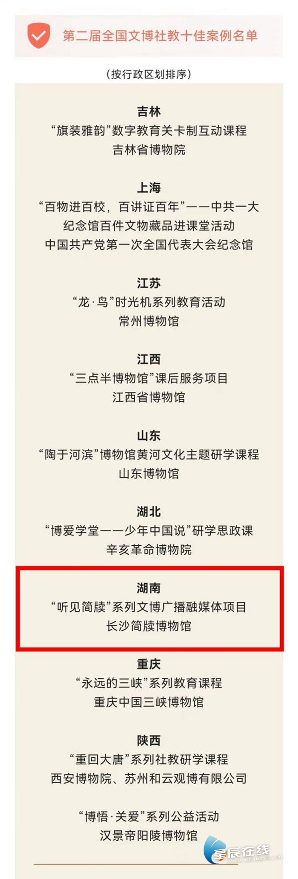 近日,由中国文物学会、中国文物报社联合主办的第二届全国文博社教十佳案例宣传推介活动终评会在北京举办。长沙简牍博物馆申报的“听见简牍”系列文博广播融媒体项目荣获全国文博社教十佳案例,这是湖南博物馆、纪念馆首次获得这一殊荣。湖南博物院申报的“阅读湖湘红色之旅”教育项目和刘少奇同志纪念馆申报的“共产党人刘少奇”系列微故事荣获优秀案例。