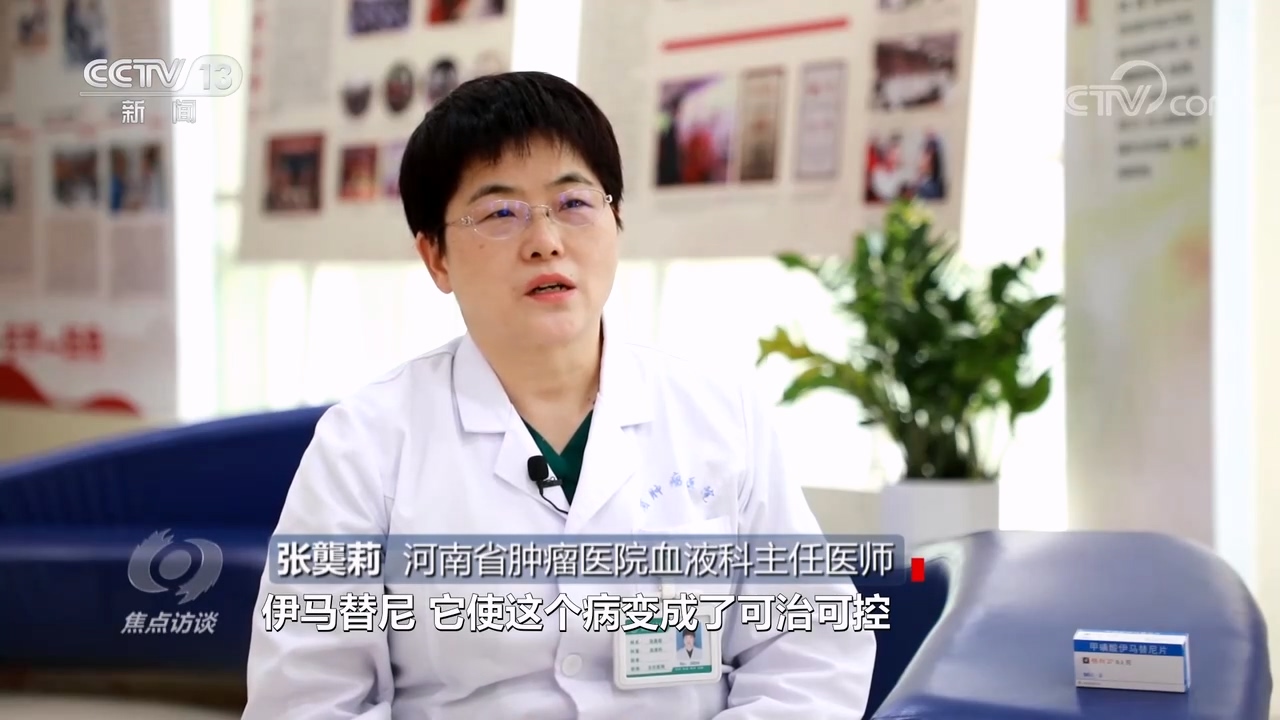 河南省肿瘤医院血液科主任医师张龑莉:“伊马替尼,使这个病变成了可治可控,但是需要长期服用。最初伊马替尼原研药‘格列卫’,患者一个月2盒需要24000元。”