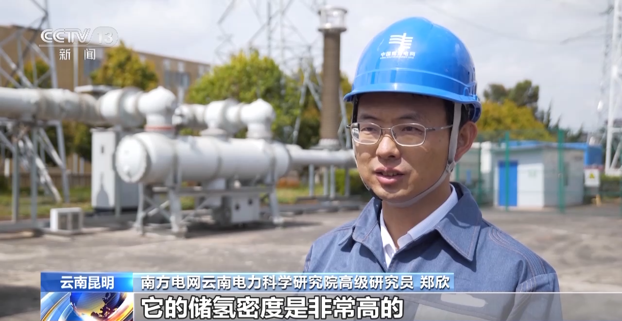 南方电网云南电力科学研究院高级研究员 郑欣:能够储存200立方米的氢气,它的储氢密度是非常高的,如果换成普通的常用的三个兆帕的储氢罐,体积要增加20倍,可能这样储存的氢气就要占满这样大半个场地的储罐。