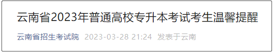 云南省2023年普通高校专升本考试考生温馨提醒