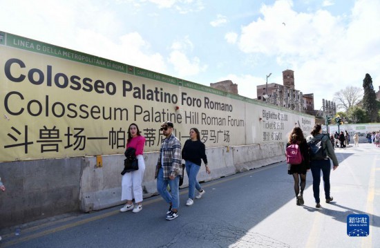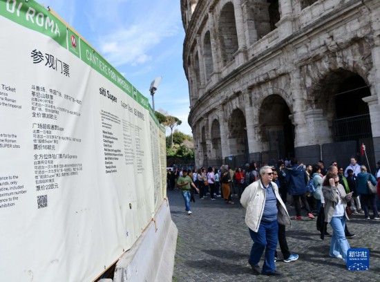 3月26日,游客走过意大利罗马斗兽场的中文指示牌。