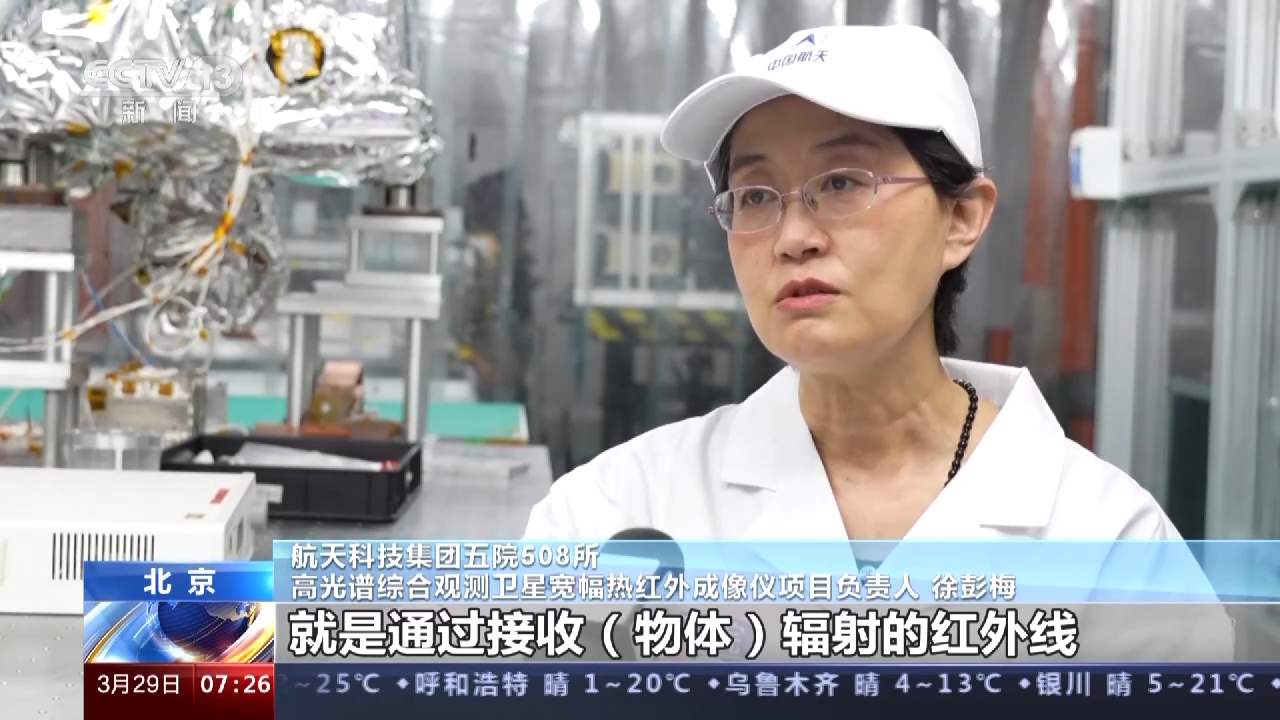 航天科技集团五院508所高光谱综合观测卫星宽幅热红外成像仪项目负责人徐彭梅:大自然里所有的物体,它自己都会辐射红外能量,我们的红外相机就是通过接收(物体)辐射的红外线,把能量接收以后成像在我们的红外探测器上,然后就得出来这个目标的一个温度的分布。
