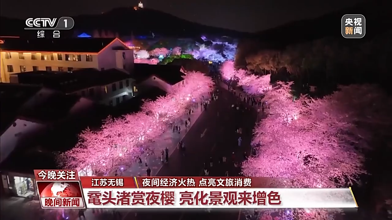 初春的夜晚,位于江苏无锡市太湖北岸的鼋头渚风景区,樱花盛放。100多个品种、30多万株樱花在光影交融中如梦似幻,伴随着景观的亮化,和水上夜游等活动,将浪漫氛围拉至顶点。
