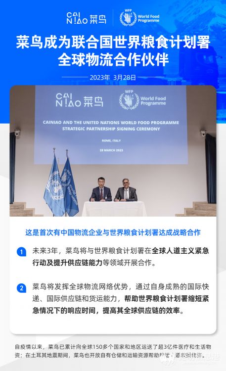 罗马当地时间3月28日,菜鸟与联合国世界粮食计划署(WFP)在罗马签署了全球物流合作协议,双方将在全球人道主义紧急行动和提升供应链能力等领域开展为期3年的战略合作。这也是中国物流公司首次成为世界粮食计划署的全球物流合作伙伴。