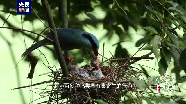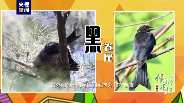 这只鸟叫黑卷尾,全身通黑,最外侧的一对尾巴羽毛向外上方卷曲,形似剪刀。而此时它正在窝里喂养的鸟宝宝却是羽毛呈灰色,且布满花纹。这并非小蝌蚪找妈妈,而是因为鸟宝宝是一只小杜鹃。黑卷尾把小杜鹃一天天喂养长大,眼看着鸟宝宝与自己长得越来越不像,却仍精心喂养、不离不弃。小杜鹃渐渐长大了,具备了独自行动的能力,却依旧不舍得离开,静静等待着黑卷尾鸟妈妈的归来。