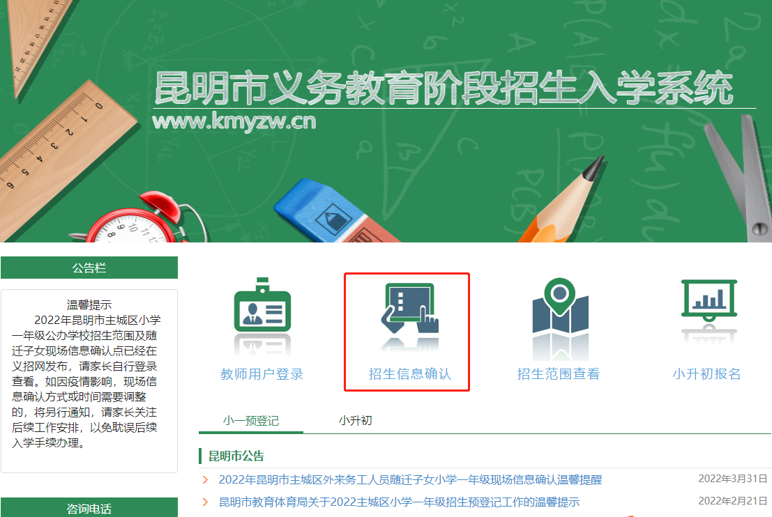 昆明市义务教育阶段招生入学系统(简称“昆明义招网”,网址:www.kmyzw.cn)。