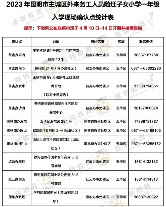 昆明信息港讯 记者上官艳君 3月31日,昆明市义招网发布2023年昆明市主城区外来务工人员随迁子女小学一年级信息确认温馨提醒,主城各区在外来人口集中的区域设立信息确认点,接受外来务工人员随迁子女一年级入学信息确认。