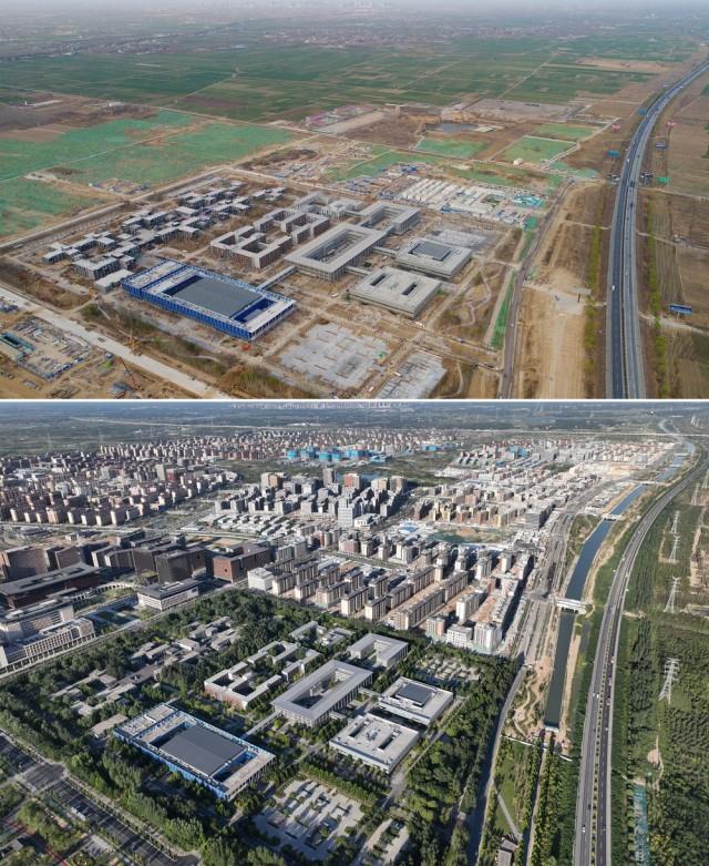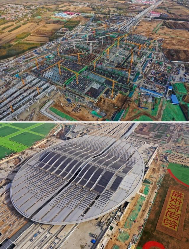 拼版照片:上图为建设中的雄安站(无人机照片,2019年11月7日摄);下图为建成的雄安站(无人机照片,2021年4月1日摄)。