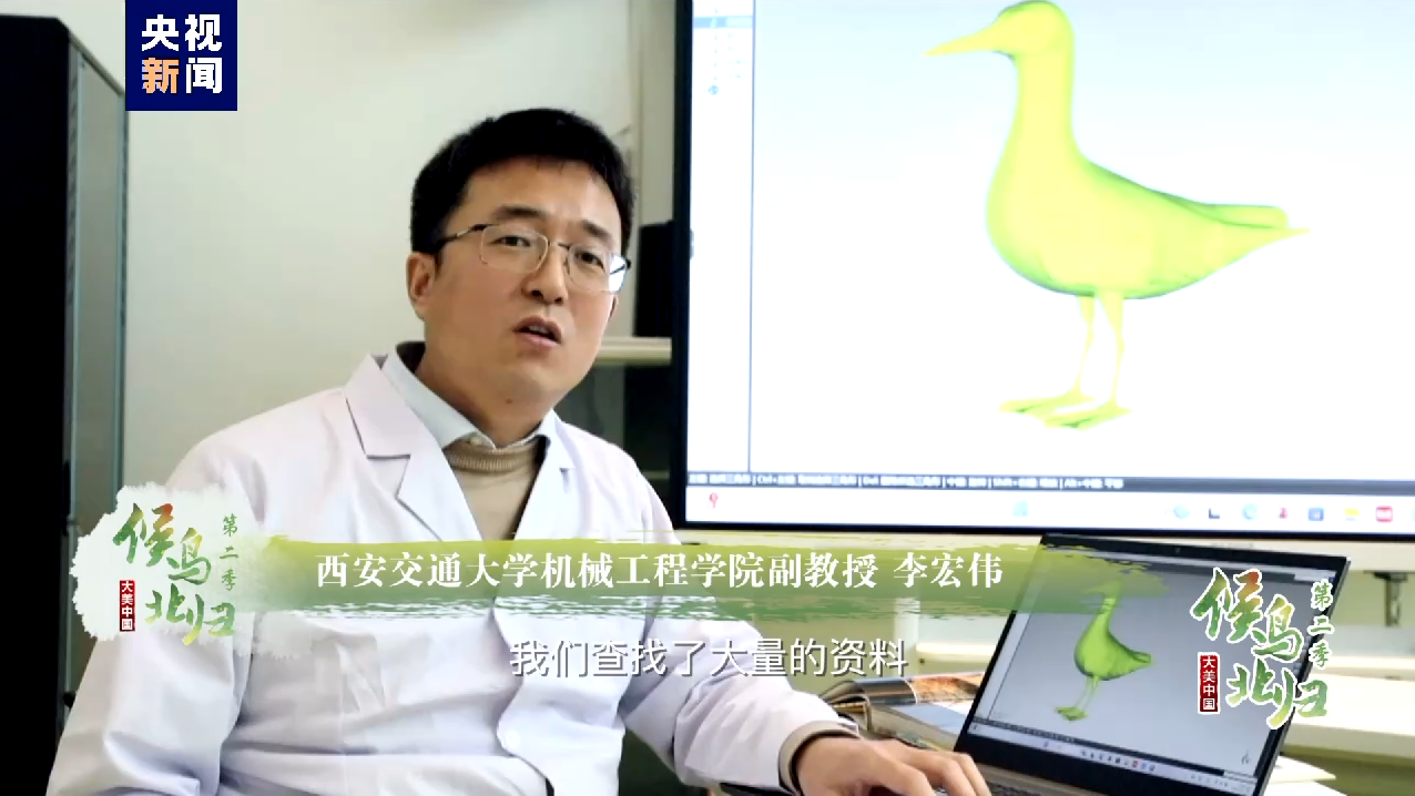 西安交通大学机械工程学院副教授 李宏伟:我们查找了大量的资料,发现它和鸽子在形态和体态上具有相似性。我们以鸽子为原型进行了初次的建模尝试,进行了十多次的迭代,得到了非常相近的三维数字模型。