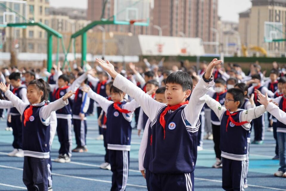 雄安新区容西片区云溪小学的学生在操场上做操(3月23日摄)。