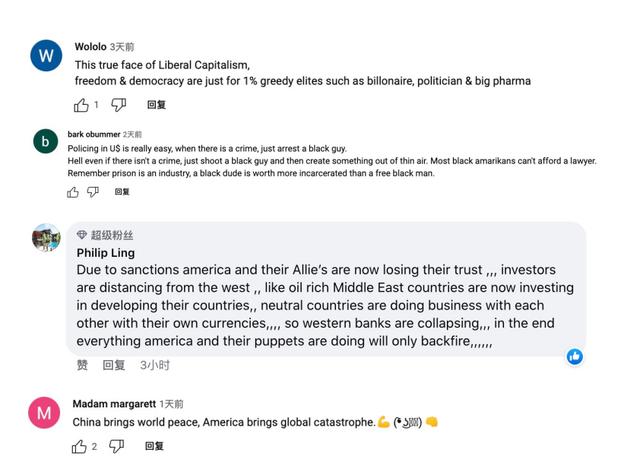 系列纪录片中所展现的真实事实,引发了海外网友的强烈共鸣。海外网友评论道,“这是自由资本主义的真实面目,自由与民主只属于少数贪婪的精英们,例如亿万富翁、政客和大型制药公司。”还有网友表示,“在美国当警察真的很容易,当发生犯罪时,只需逮捕一个黑人。就算没有犯罪,也可以射杀一个黑人,然后凭空造出什么东西来。因为大多数美国黑人请不起律师。记住,监狱是一个行业,一个黑人比一个自由的黑人更值得被监禁。”有海外网友清醒指出,“由于制裁,美国和他们的盟友正在相互失去信任,投资者正在远离西方……所以西方的银行都在倒闭。美国和他们的傀儡所做的一切只会适得其反。”还有海外网友真切指出,“中国带来世界和平,美国带来全球灾难。”