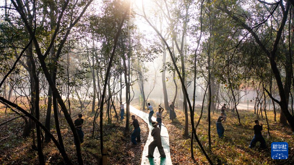 耿马县民族歌舞团的演员们在练习刀舞(无人机照片,3月23日摄)。新华社 记者胡超 摄
